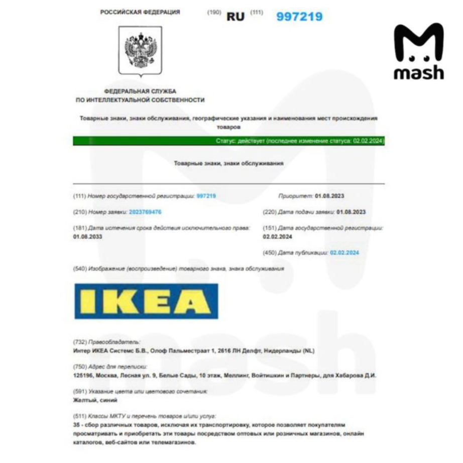 Известно, что IKEA продлила право на товарный знак до августа 2033 года. В пакет вошли фирменный логотип, полный перечень услуг компании и разрешение официально продавать свои товары в России. Заявка была подана штаб-квартирой компании в Нидерландах 1 августа прошлого года, и была одобрена в Роспатенте 2 февраля.