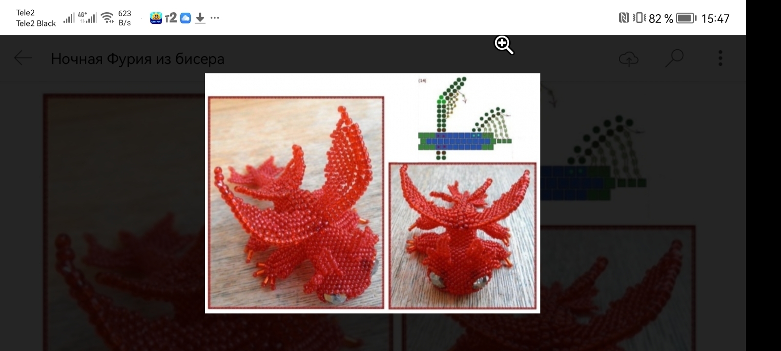 Чтобы сплести крылья, вам нужно будет сплести около 20 рядов крупного бисера, используя технику ндебеле. Сплетите еще шесть рядов, в конце привяжите бусину, а затем вернитесь через две бусины к началу сетки крыльев. Вплетите мелкий бисер, следуя схеме на рис. 14. Пришейте крылья сразу к спине, где находится узор из крупных бусин. Форму и размах крыльев можно смоделировать, в плетая проволку во круг крупных бусин.