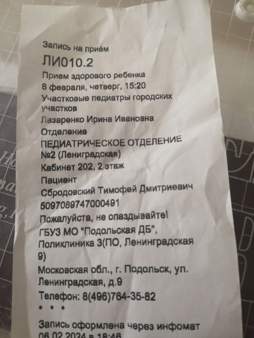 Талончик на посещение. Полина нам его взяла, когда ехала из колледжа. Специально заходила за талоном.