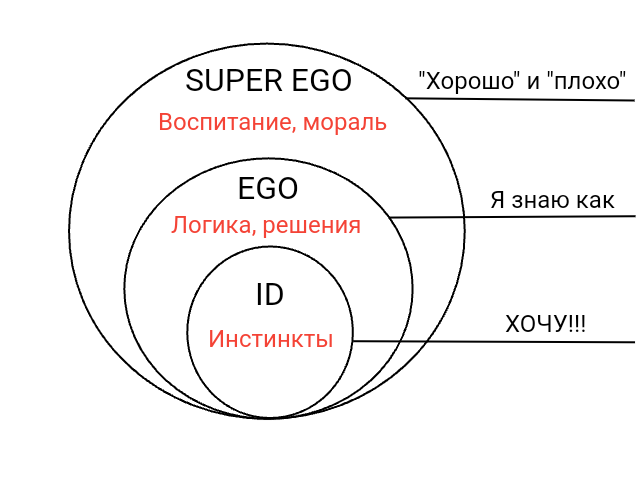 ID (ОНО) - самый глубокий компонент личности, бессознательная часть психики, содержащее в себе инстинкты, немедленное удовлетворение желаний (голод, секс, безопасность) без оглядки на обстоятельства и нормы морали. Не знает что такое “хорошо” и “плохо”, не знает как получить желаемое. ID испускает импульс “хочу это прямо сейчас !”.