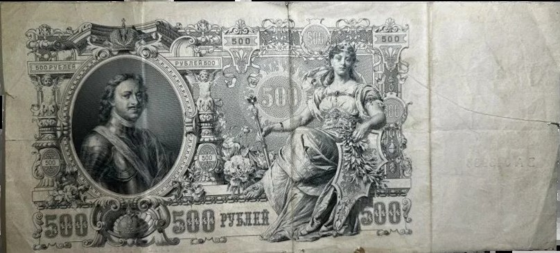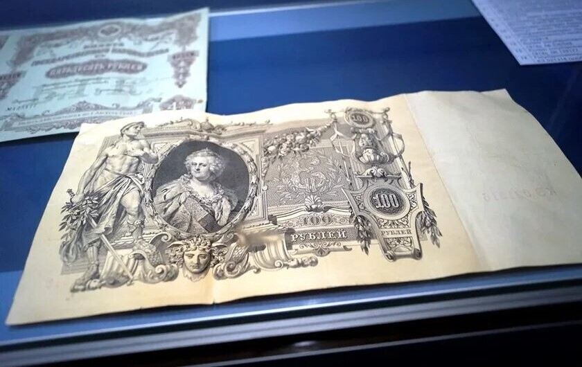 Это первые купюры, на которых печатали портреты людей. На 100 рублёвых - портрет императрицы Екатерины II, называли "катенька", а на 500 рублёвых портрет Петра I называли "петенька".
