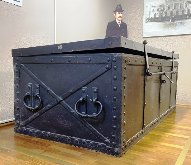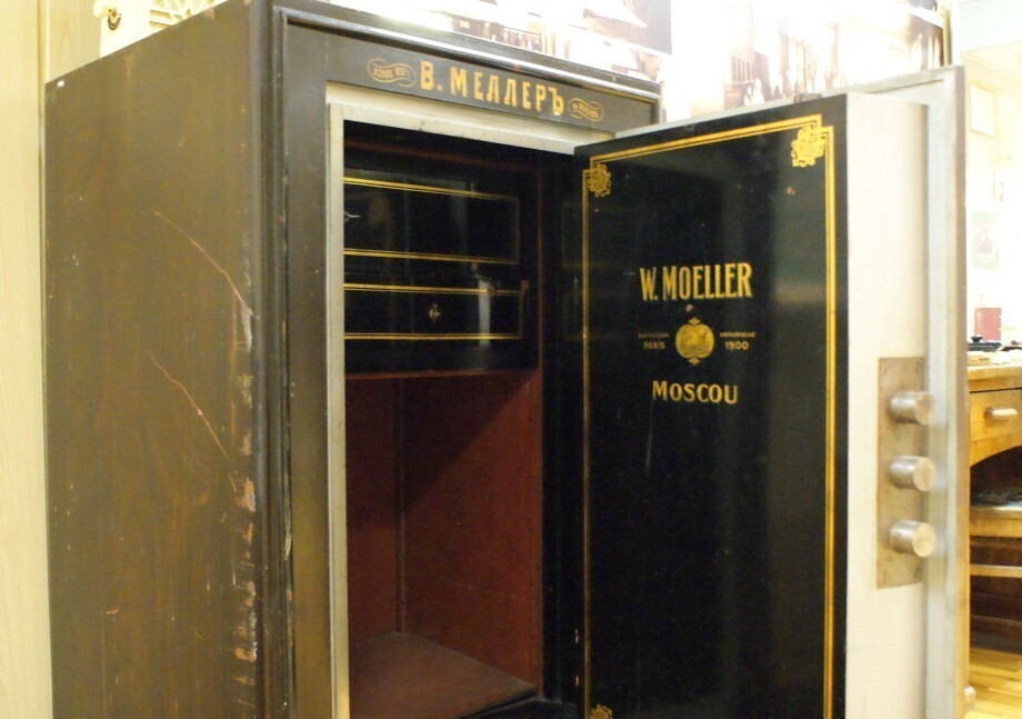 Хранится сейф 1900 г. выпуска фирмы В. Миллера весом 700 кг и сундук 1837 г. Высота его почти один метр, длина около двух метров. В сундуке деньги хранились до 1961 г. Чтобы положить в него деньги, два сотрудника заходили во внутрь сундука, а третий передавал.