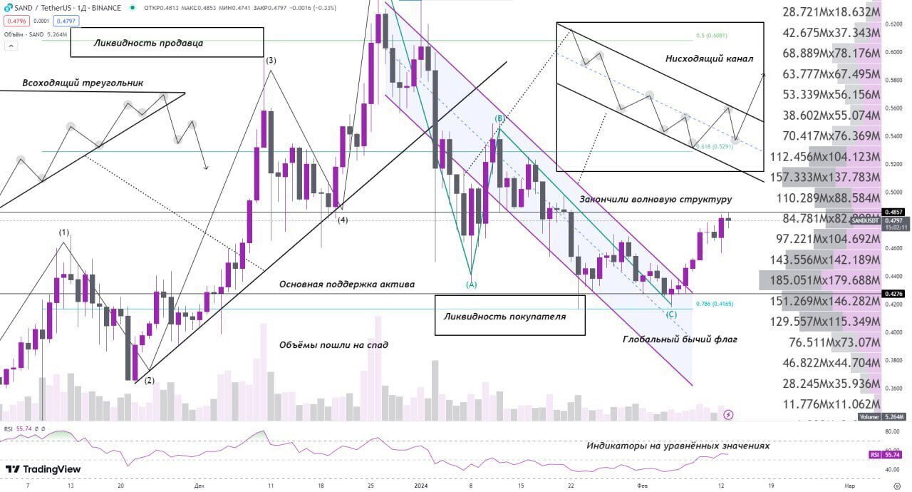 Если посмотреть более глобально, то можно заметить, что актив формирует бычий флаг и уже развивает его третью часть. Волновая структура полностью завершила свой цикл и готова к началу нового 🆗
