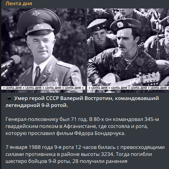 Это действительно печальная новость о смерти генерал-полковника Валерия Востротина. Он был настоящим героем и военным лидером, который не только командовал 9-й ротой во время войны в Афганистане, но и принимал участие в ряде других операций.