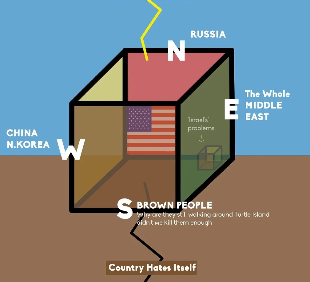 На севере Америка уже проиграла России. На юге они сталкиваются с собственным незавершенным геноцидом - надоедливые коричневые люди все еще ходят по земле, не уважая колониальные границы. Далее, на востоке, - незавершенный геноцид Израилем Палестины, превратившийся в региональное восстание против Америки. Наконец, на западе есть Китай, с которым Америка действительно хочет бороться, но они не могут даже подойти к стойке бара без того, чтобы десять других парней не нанесли им удар.