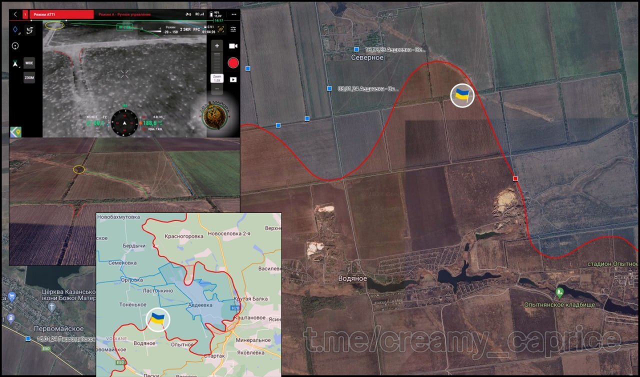 Обстрел с дрона ВС РФ позиций ВСУ в окрестностях населённого пункта Северное.