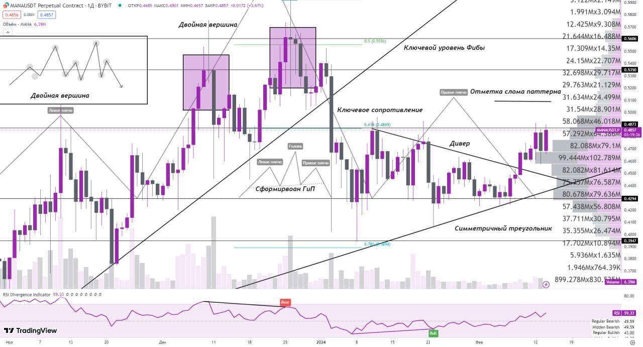 Сформировали сходящийся треугольник и пробили его импульсивно в лонг, но тут объективно заслуга BTC, который просто увёл MANA за собой. Естественно мы коррелируем с основным рынком и это нужно упомянуть.