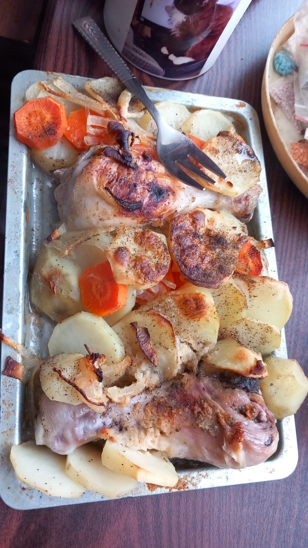 Теперь приступим к приготовлению самого блюда. Нагрейте духовку до 180 градусов. Далее, возьмите противень и разложите на нем порции курицы так, чтобы между ними было немного пространства. Посолите и поперчите мясо по вкусу, можно добавить пряную приправу для дополнительного аромата. Затем разложите на курице лук, картофель и морковь. Поставьте противень с блюдом в духовку и запекайте около 1,5-2 часов.