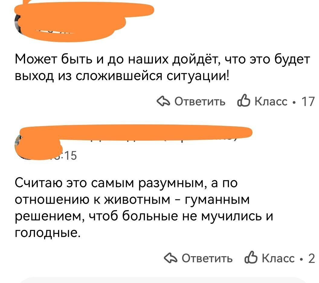 Интересно читать комментарии. Кто-то пишет, что это выход из ситуации. Серьезно? Ну истребят сейчас всех бездомных собак. Да только они каждый день появляются все новые на улицах, убегают, видите ли. Реально, каждый день все новые фото "найденышей". Как? Я спрашиваю, как? Как можно потерять свою собаку? Ответ очевиден - никак, ее можно просо выкинуть. Отпускание на самовыгул - это то же выкидывание и никак иначе! "Я отпустила ее погулять, а она убежала". Мозг случайно не убежал вместе с собакой? Или его и не заводил никто?А раз собаки появляются ежедневно в ужасающих количествах, то их постоянно надо отстреливать. Каждый день все новых бездомных. Да что уж тут, давайте лишнее уберем, сразу по домам ходите да уничтожайте собак, чего их выпускать? Подумаешь, одну ступень пропустим.Так может решение все же не в этом, а в привлечении хозяев к ответственности? В финансировании приютов? Теперешних собрали по приютам, а те, что в семьях хорошенько отслеживаются, чтобы не выкидывали. Вот это решение. И кстати, это и есть гуманность, а не то, о чем пишут комментаторы.Такие добренькие, чтоб не мучались больные и голодные. Так они бы и не мучились, если бы их не выкинули на мучительную и голодную жизнь. Не так? Постоянно все кричат, что надо решать проблему бездомных собак, страшно всем. А собакам не страшно? И самое интересное, что решение все видят в одном - в истреблении. Почему ни у кого не возникает идей, как убрать животных с улиц действительно гуманно?Я снова продвигаю идею волшебного города. Но чем больше я читаю комментарии о животных, тем меньше моя вера в людей и в волшебный город. Давайте каждый подъезд скинется и поставит возле подъезда будку или домик для животных. Поселит туда животное, а может и не одно, и всем подъездом будут его кормить. И вот бездомное, голодное, холодное, озлобленное животное превратилось в доброе, дворовое, сытое и ласковое. И так возле каждого подъезда, возле каждого дома. И все, проблема решена. А еще будем отслеживать нерадивых хозяев. Видите у соседей собака пропала, надо выяснить и наказать штрафом в пользу приюта.Вот что значит гуманное решение проблемы! Но это слишком по-человечески, а человеков осталось слишком мало...