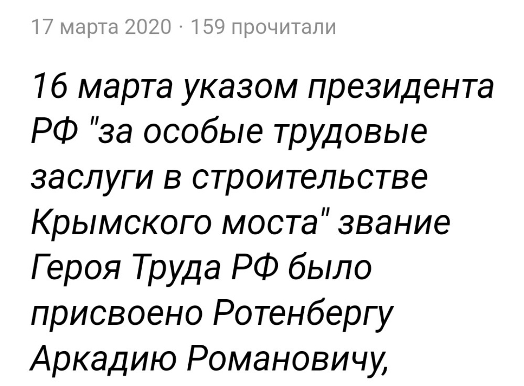 Ведь все смутьяны, кто на небесах, а кто в казематах или спец больнице давно там, а герои России - Ротенберг (напомню: 16 марта 2020 года указом президента РФ "за особые трудовые заслуги в строительстве Крымского моста" звание Героя Труда РФ было присвоено Ротенбергу Аркадию Романовичу)