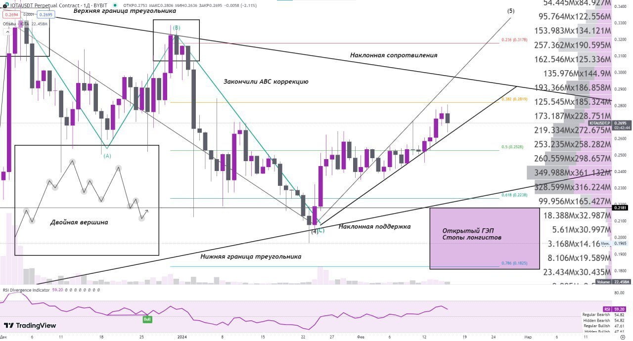 ➡️Техническая часть. Монета сформировала двойную вершину и вогрузилась в длительную коррекцию, в ходе которой пришла в область сильной поддержки на отметке 0.2194$ и отскочила от неё. Ситуация довольно патовая на первый взгляд.