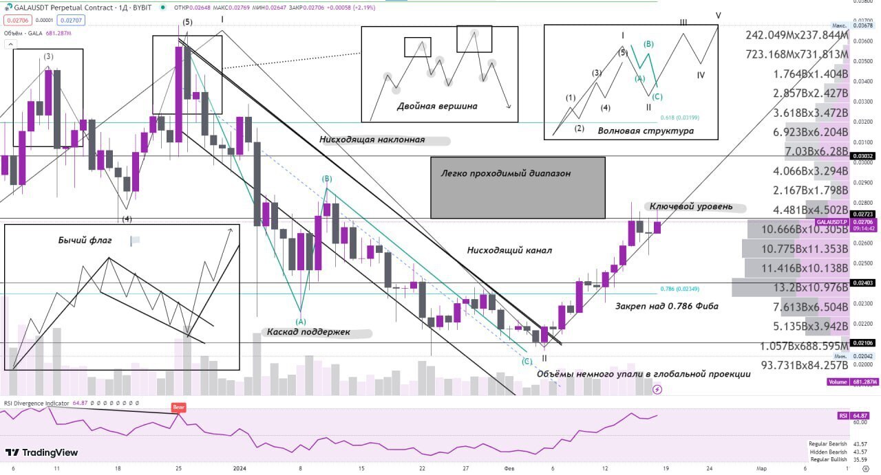 Получили закреп над уровнем 0.786 по Фибе или 0.02354$. Снизу собран большой костяк локальных поддержек, стимулирующих актив. За сопротивлением 0.02711$ расположен локальный ГЭП, в котором практически нету ликвидности, а это значит, что данная область будет пройдена кране быстро.