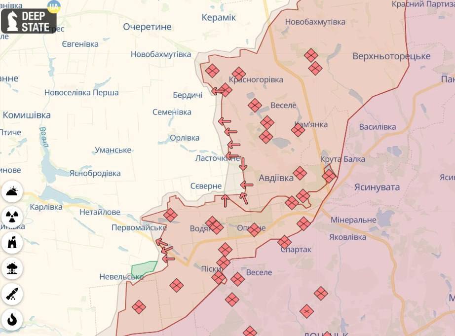 — Z-блогеры сообщают об атаке на село Ласточкино, которое находится к западу от Авдеевского коксохимзавода. Украинский проект DeepState также подтверждает, что ВС РФ достигли населенного пункта.