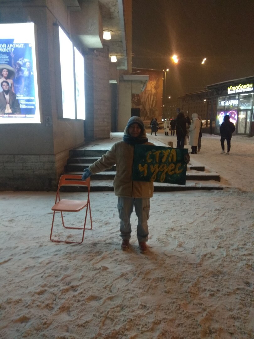 На днях со мной со мной произошёл интересный случай. Сейчас вам всё расскажу. Я уже приехала на свою станцию метро. Выхожу из самого метро, спускаюсь по лестнице, которая ведёт на улицу и вижу, как трое человек стоят и предлагают присесть на стул. Ещё подумала, а зачем садиться то? И девушка мне позировала с табличкой. Но при этом она говорила, вы фотографируйте и присаживайтесь.