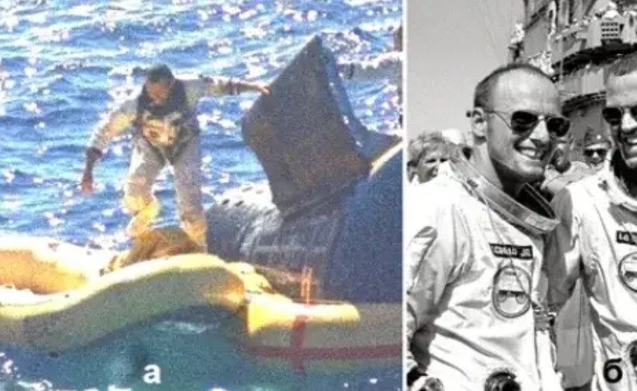 В НАСА, очевидно, этого не знали, поскольку никогда не отправляли астронавтов на орбиту вокруг Земли. Поэтому во время своих фальшивых обратных миссий он представлял себе лихих, свежих и энергичных астронавтов, перепрыгивающих с корабля на корабль. Это фотография экипажа "Джемини-5" 1965 года, который только что приводнился в океане и собирался прыгнуть (в буквальном смысле) на авианосец, чтобы забрать их.
