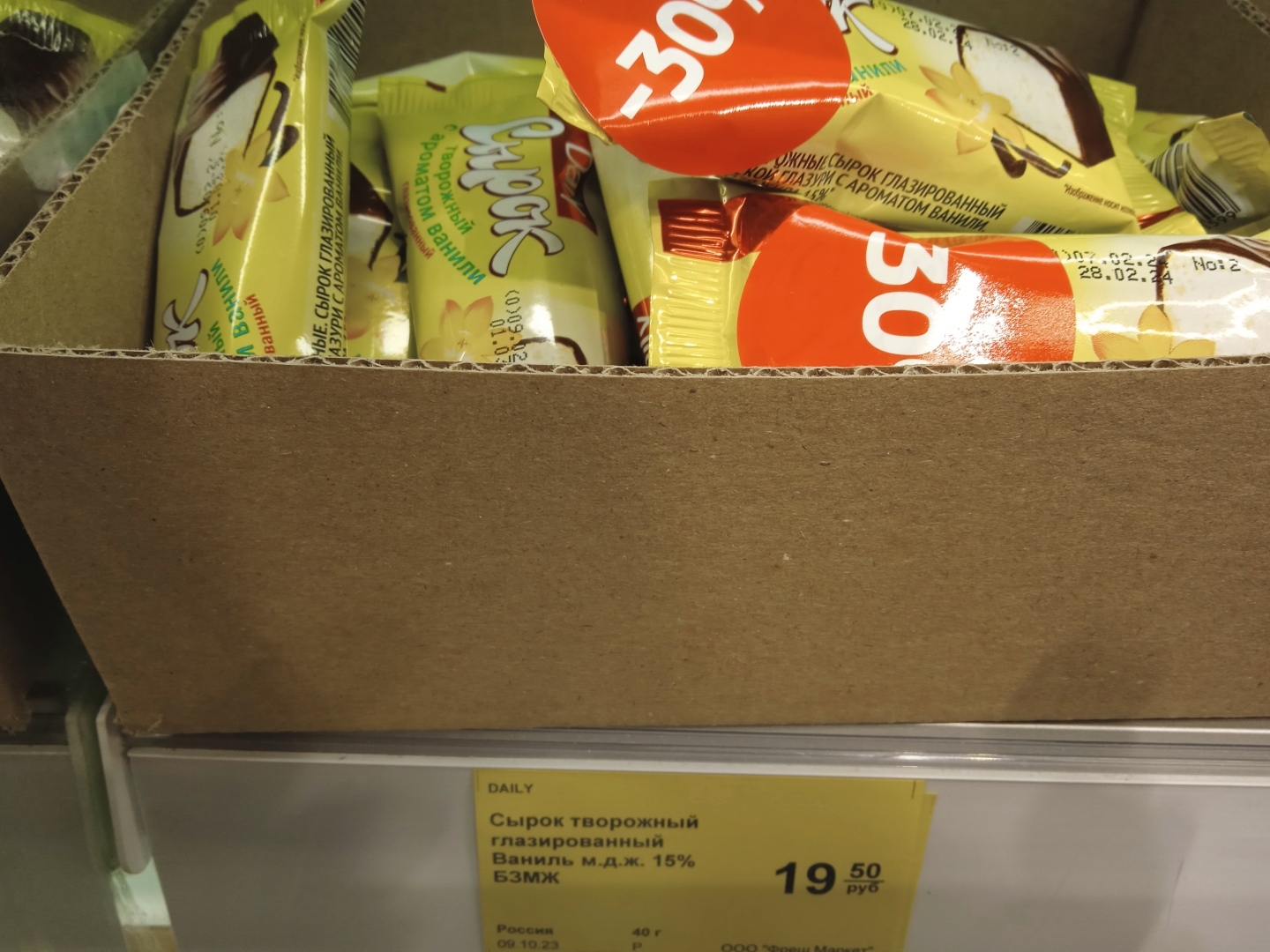 Можно полакомиться творожными глазированными сырками. Со скидкой они вам обойдутся всего-то в 14 рублей! Нынче это не деньги – дешевле четырёх спичечных коробков...