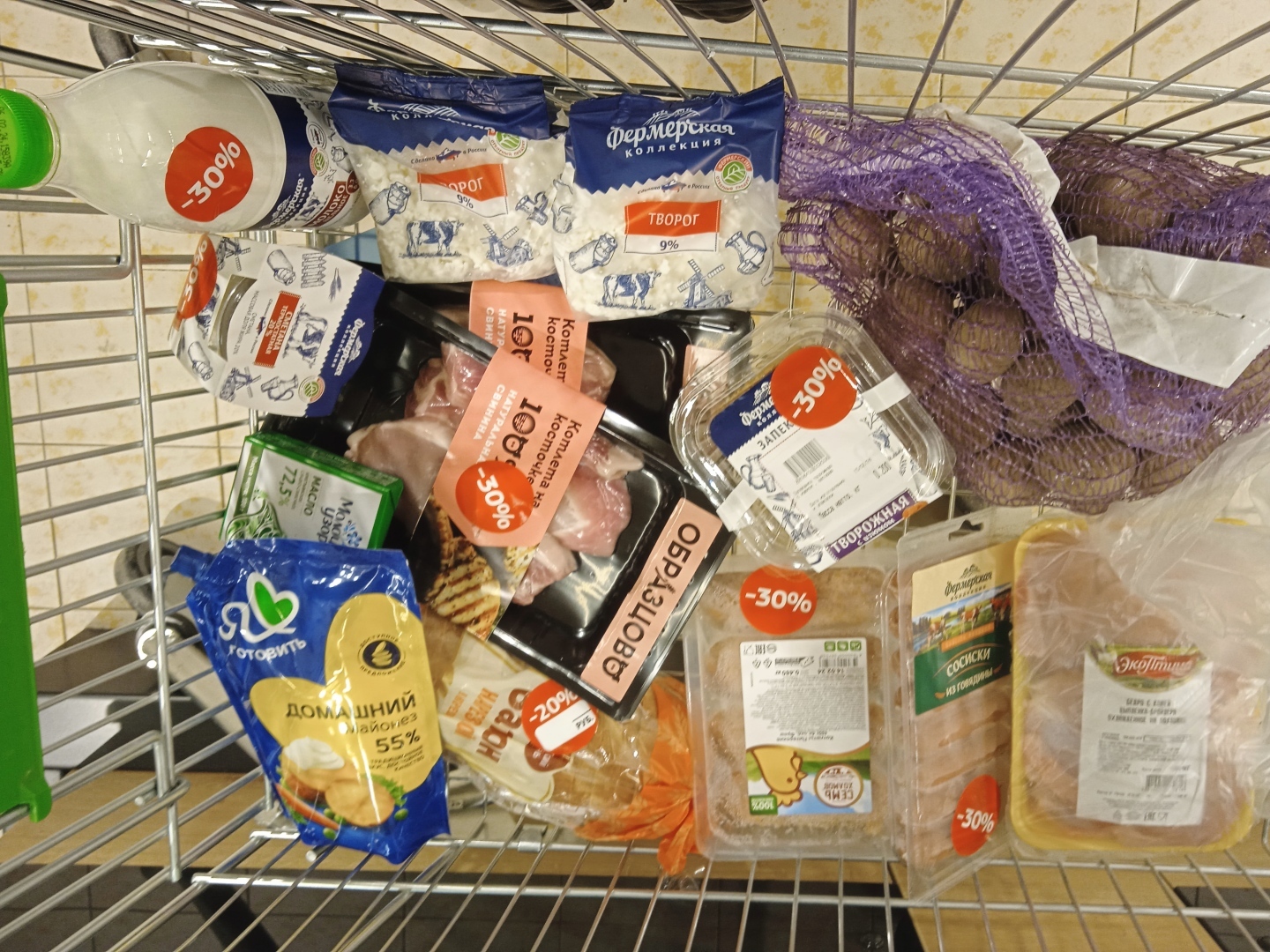 Мои покупки в гипермаркете представлены на фото ниже. Как видите, я прикупила ещё молоко, сметану, творог, сливочное масло, батон, котлеты на кости из свинины фирмы "Образцов".