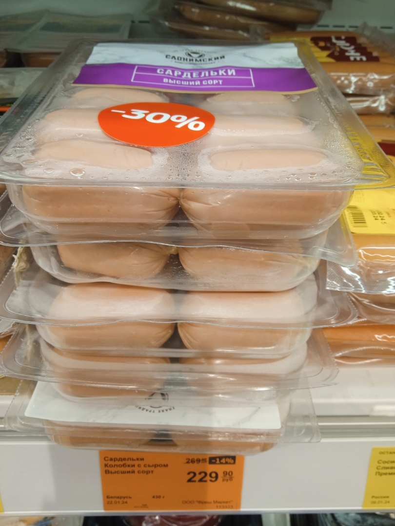 Сардельки высшего сорта из Белоруссии мало того что по акции, да ещё и с той же 30%-ной скидкой: 161 рубль за упаковку.