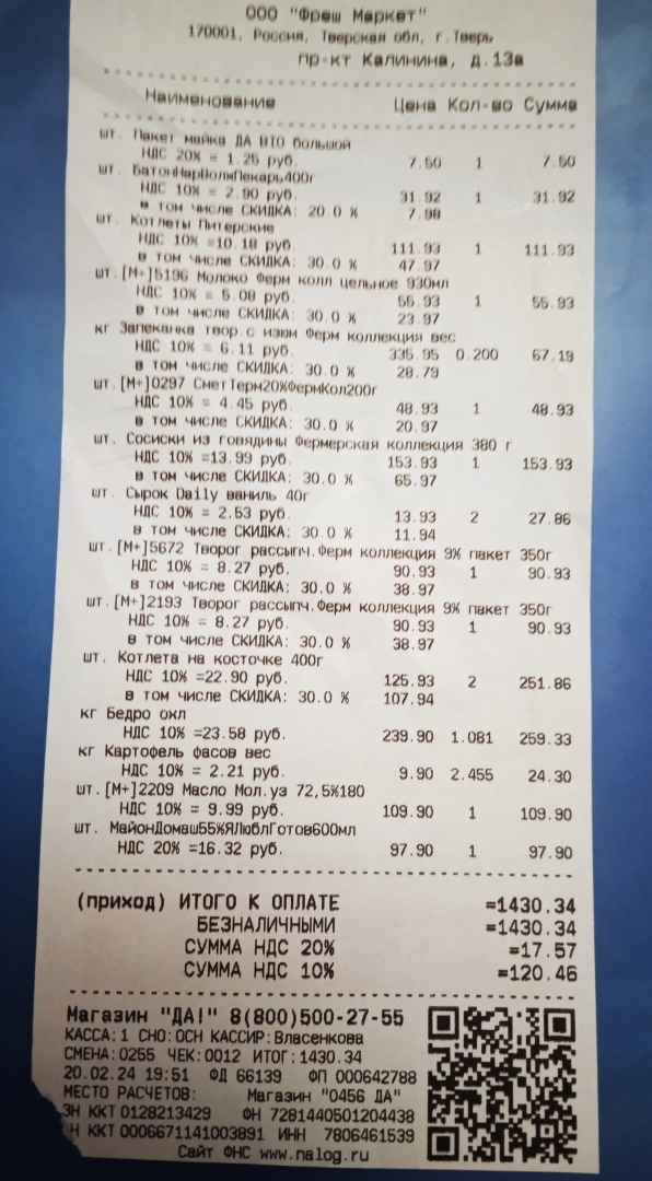 Увенчал все мои покупки кассовый чек на общую сумму в 1430,34 рубля из которых чуть более 138 рублей ушли в счёт налогов (НДС) в государственную казну. Так что если кто-то говорит вам, что пенсионеры не платят налоги – ВРУТ! Пенсионеры налоги платят! Взять тот же налог на добавленную стоимость.