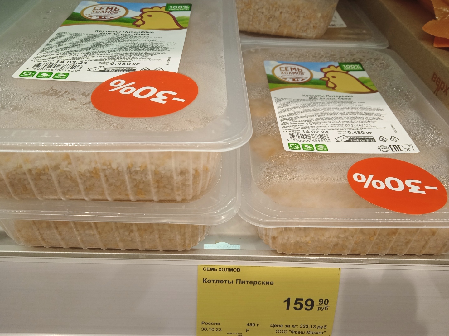Котлеты "Питерские" от "Семи холмов" имеют неплохой вкус и приемлемую цену, учитывая скидку. Лоток из 4 котлет в 400 г обошёлся мне сегодня в 112 рублей.