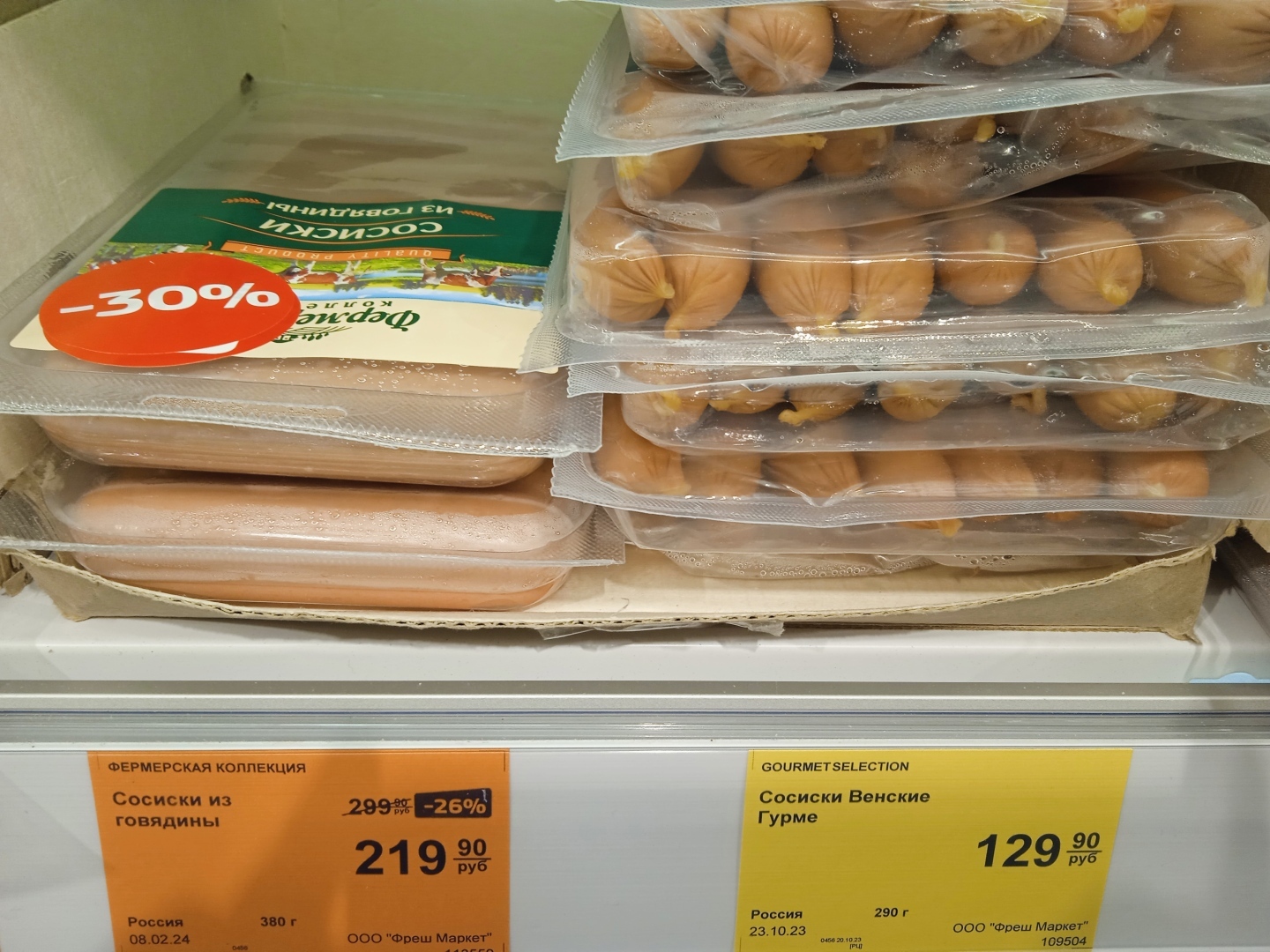 Сосиски говяжьи от "Фермерской коллекции": 154 рубля за 380 г. Не плохо, согласитесь!