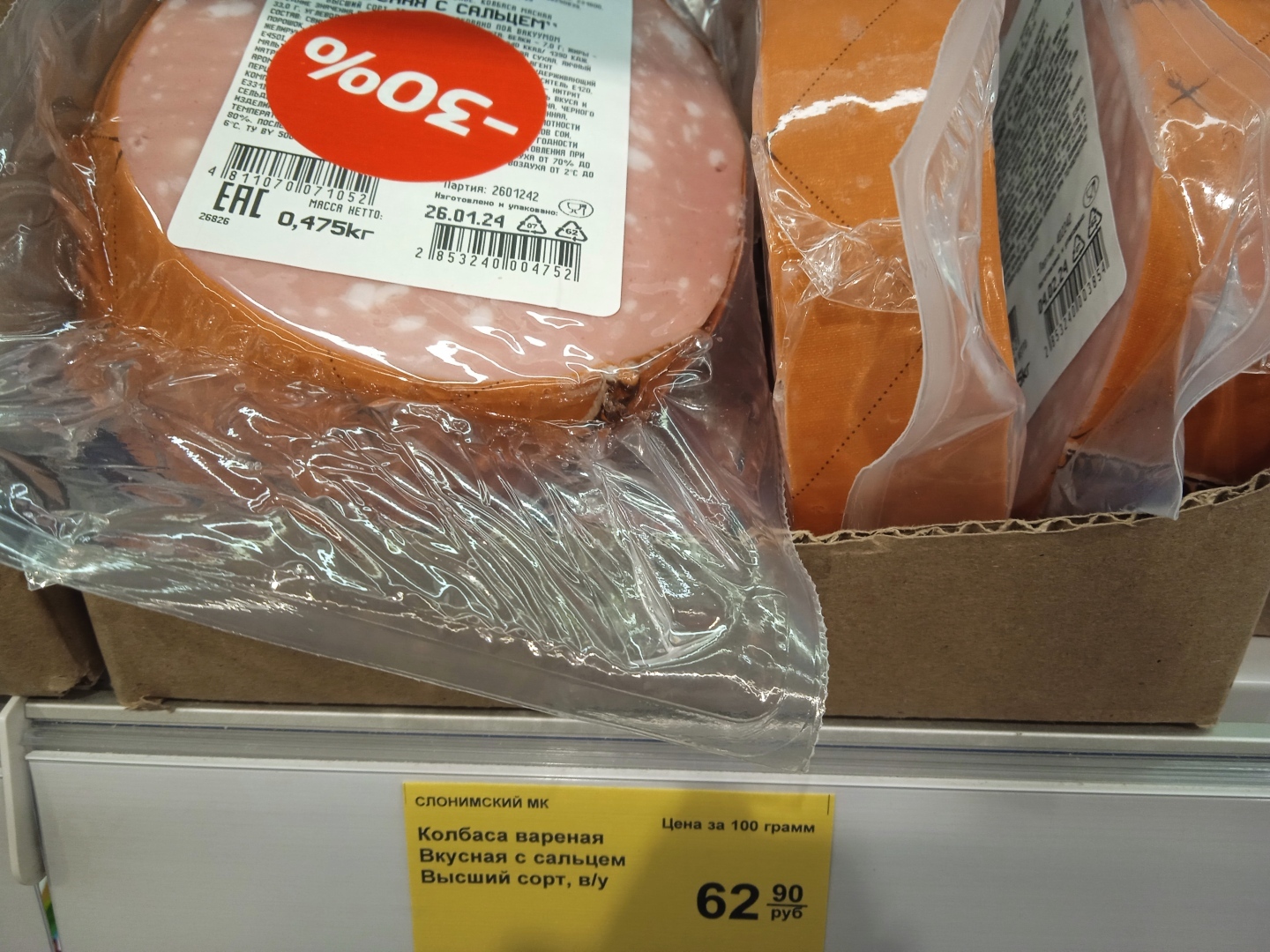 И вновь на прилавке магазина белорусская колбаса варёная с сальцем! Колбаса высшего сорта, очень вкусная: всего за 441 рубль за килограмм со скидкой!
