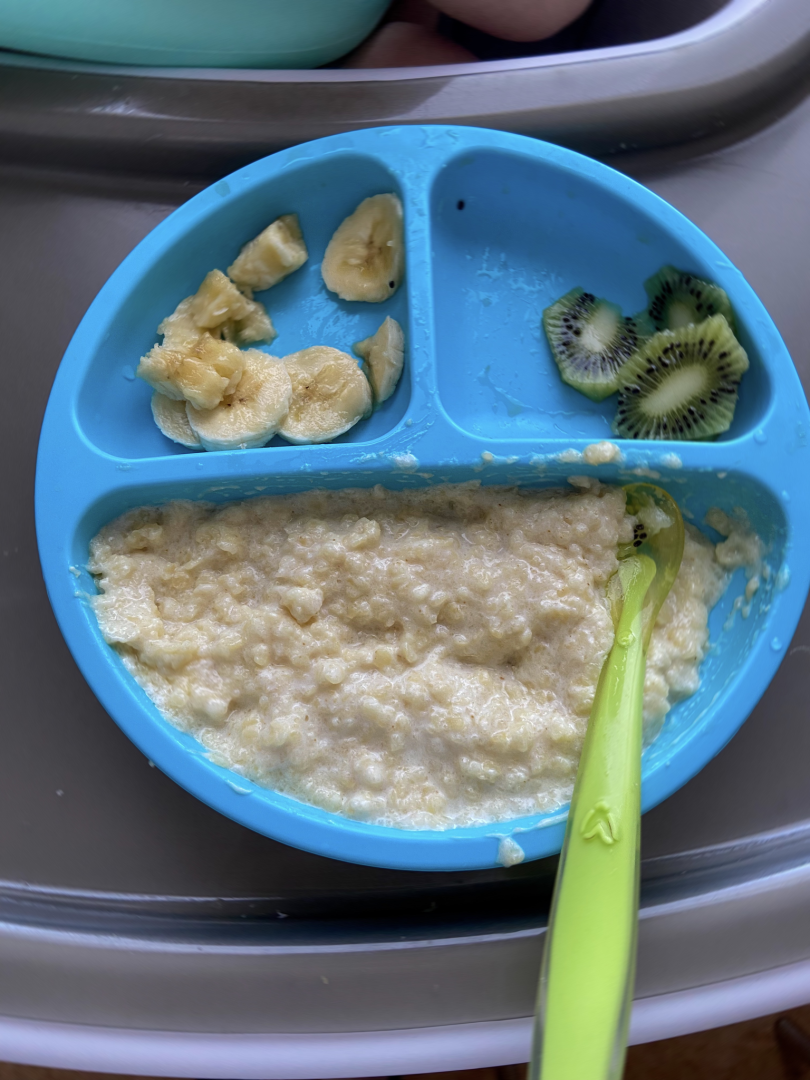 Обычно это каша с фруктами или оладушки со сметаной.