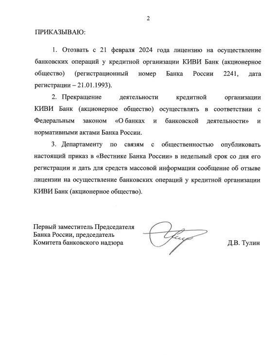 Вашему вниманию представляю приказ об отзыве лицензии Центральным банком у QIWI-банка: