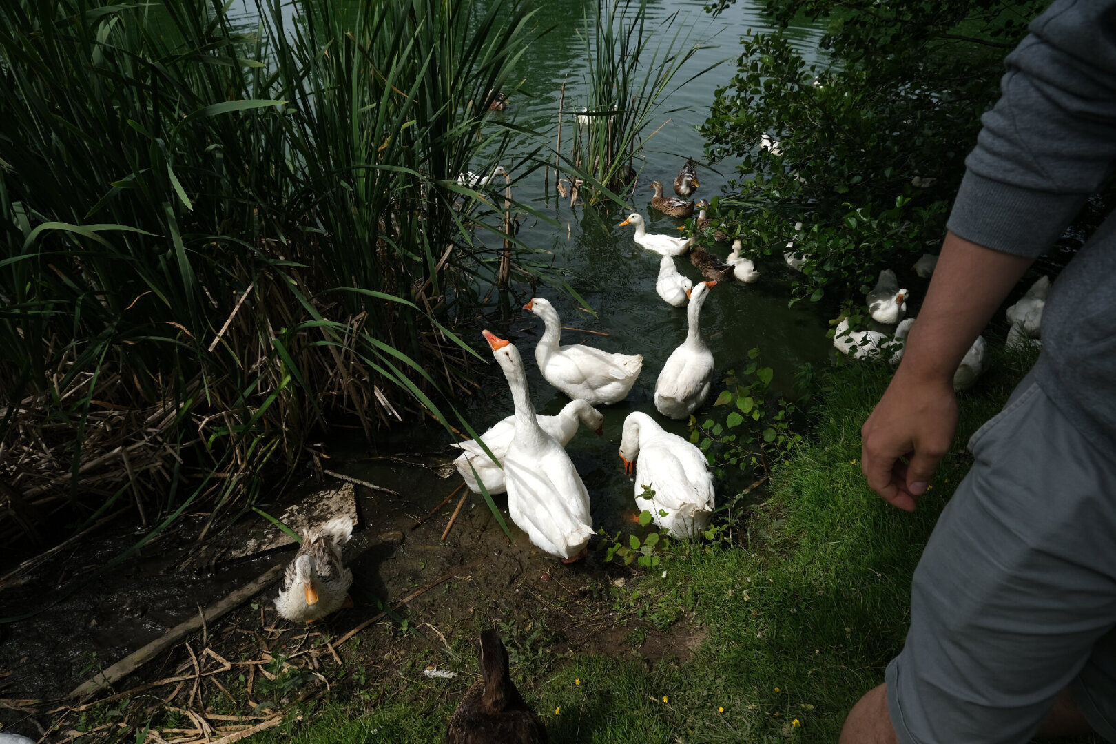 По дороге домой, через посёлок Приморье, мы всегда заезжаем на пруд. Там всегда много гусей и уток. Берёз из дома для них хлебушек.
