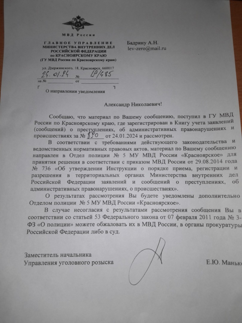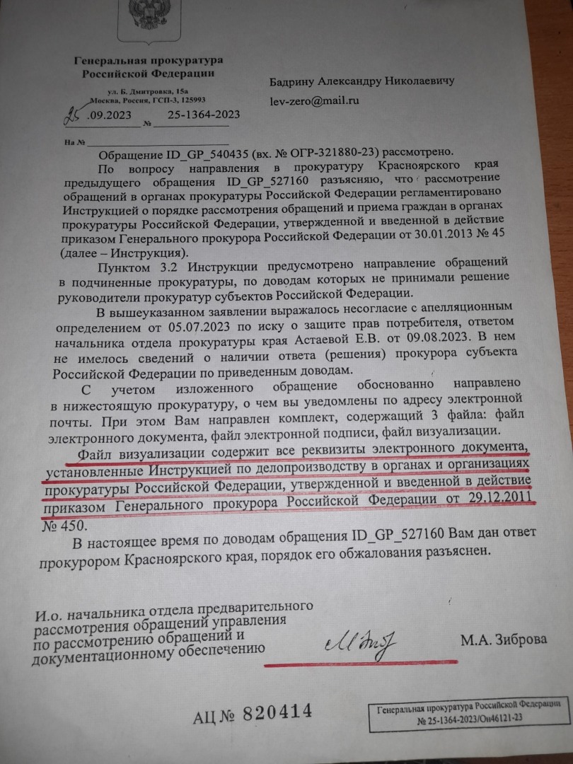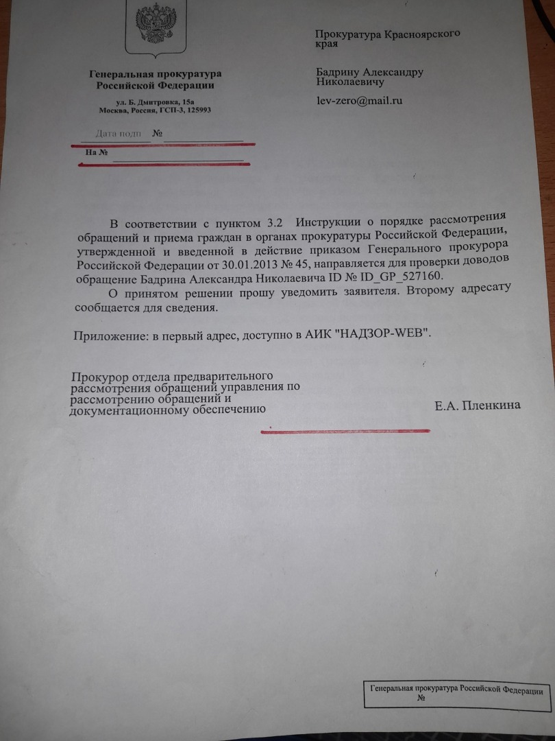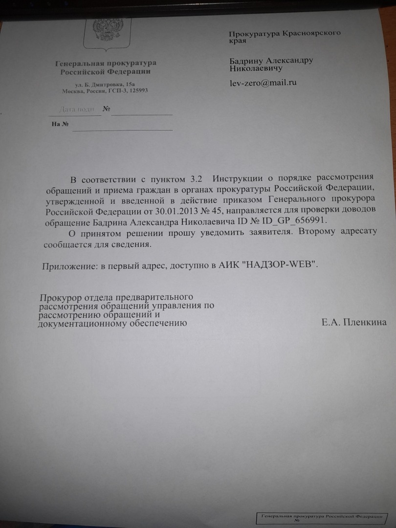 согласно ID 656991,то это информация по жалобе в порядке 124 УПК РФ.То что сроки рассмотрения жалобы даже трудно назвать разумными,но как Вам документ,который пришел с Генеральной прокуратуры РФ - ни даты,ни номера,ни электронной подписи. Фамилия Пленкина натолкнула меня на прошлые казусы Генеральной прокуратуры РФ.В августе 2023 года была получена вот такая информация