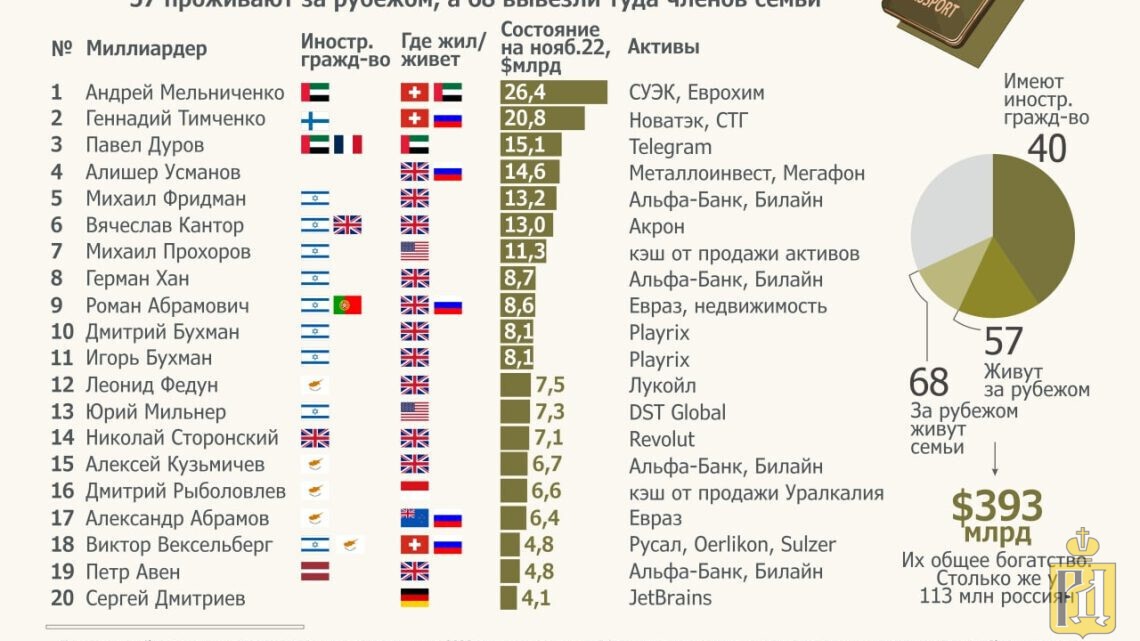 Российский бизнес тоже побежал. На платформе «Равенство. Медиа» приводилась информация, сколько российских миллиардеров из списка Forbes имеют иностранное гражданство, проживают за границей или проживают за границей родственники.