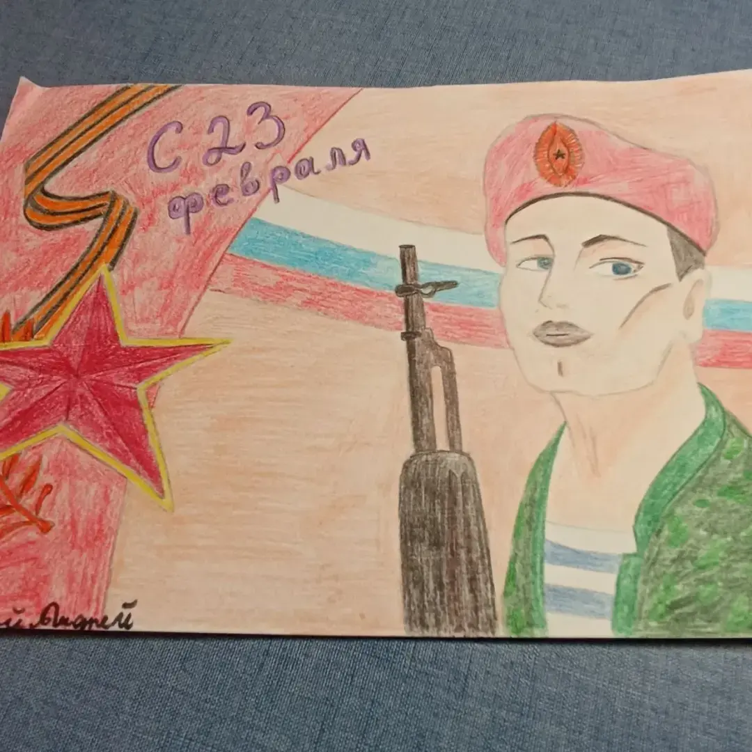 Мы часто с сыном рисуем для школьной выставки. Точнее, я рисую. Один раз даже выиграли первое место. А этот рисунок, приуроченный к 23 февраля у нас не приняли, учительница сказала "поздно принёс", хотя на календаре было 10 февраля, видимо, это был предлог, чтобы наш рисунок снова не занял первое место. Другие дети тоже должны побеждать, точнее, родители других детей.
