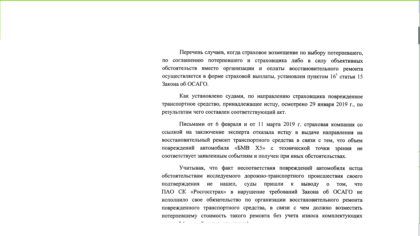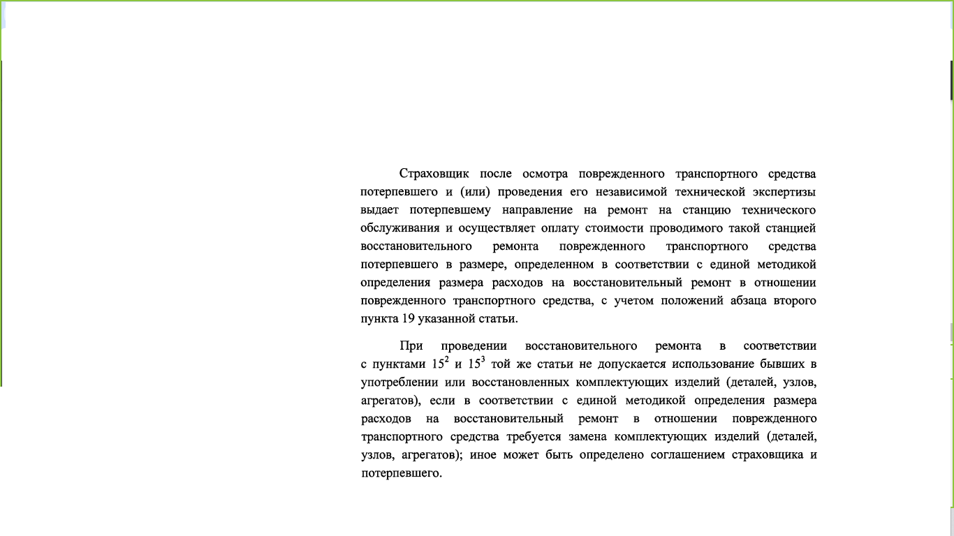 В случаях, когда страховая компания осуществляет страховое возмещение в виде выплаты с нарушением п. 16.1, она нарушает требования закона. Страховая компания не имеет права по своему усмотрению менять порядок осуществления страхового возмещения. Простыми словами, СК не может просто так, захотев, вместо ремонта выплатить возмещение с учетом износа.