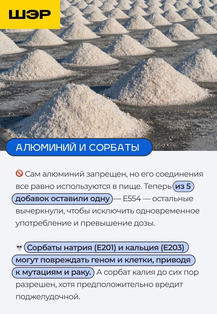 ❌Самые известные уже запрещенные в РФ добавки — канцерогенный формальдегид и нейротоксичный алюминий. Раньше они использовались в пищепроме как консервант и краситель.