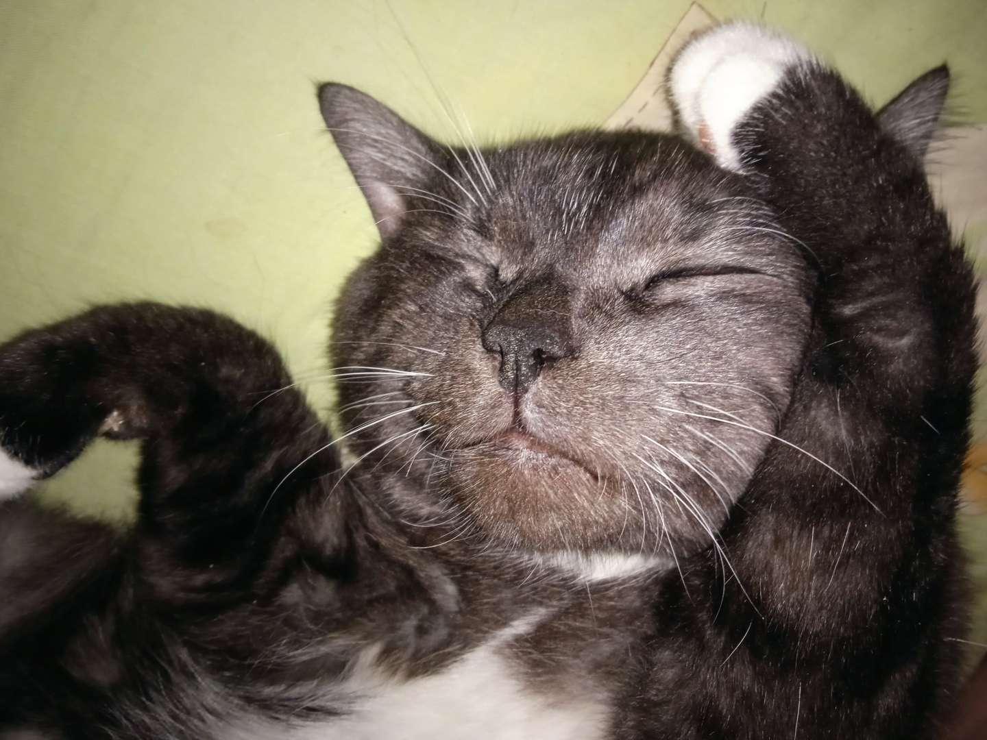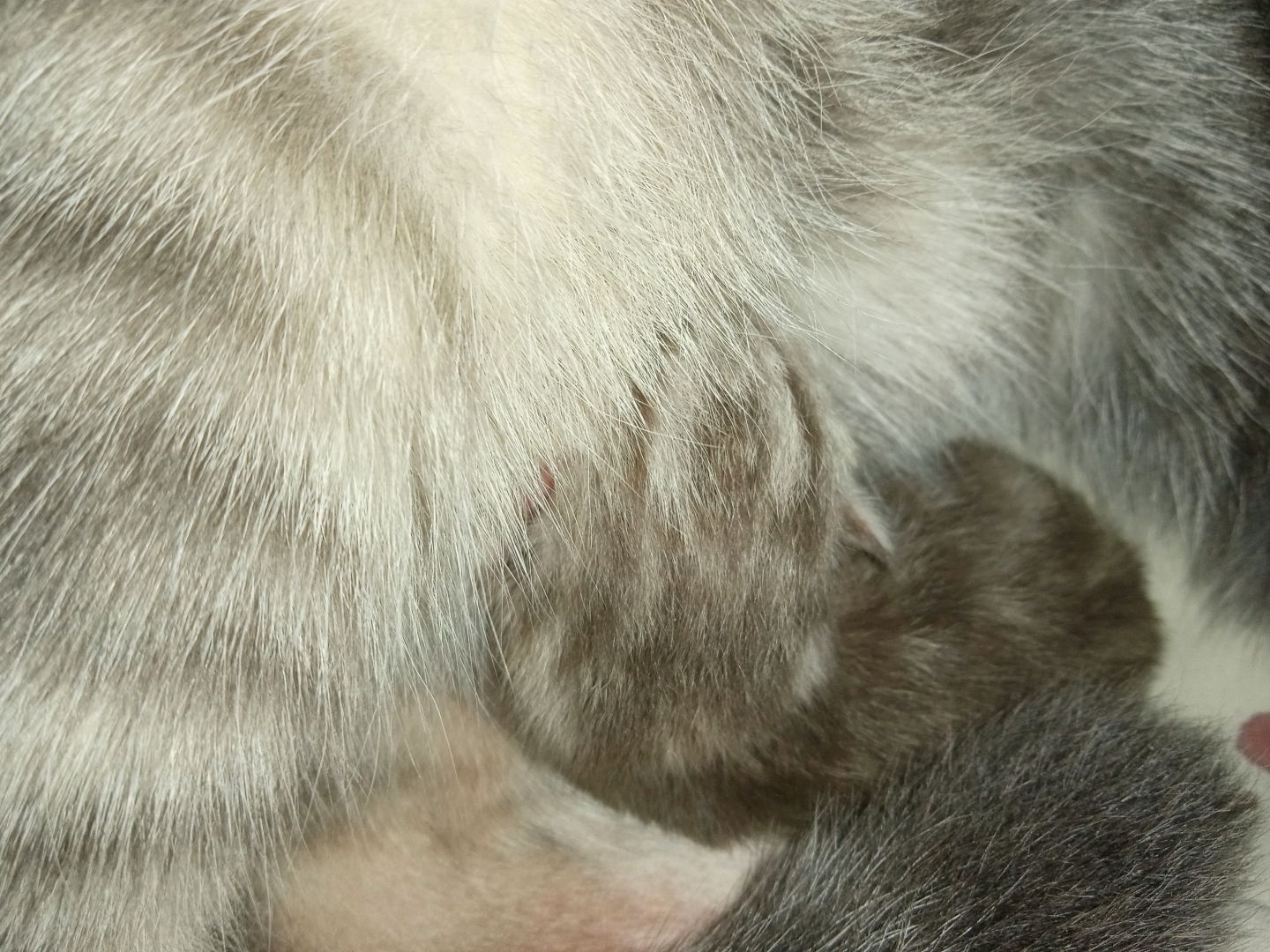 И вот они уже в нирване: котёнок титьку сосёт, а мамочка его отдыхает, протянув лапки.