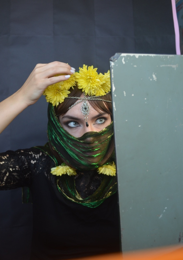 Покажу немножко рабочей атмосферы, это я недовольно поправляю постоянно выпадающие из волос цветы.