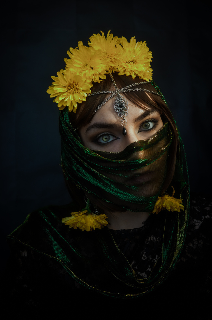 Мне нравится тёмный тон на фото, впечатление загадки и упор на взгляд, а не на цветы и яркую ткань.