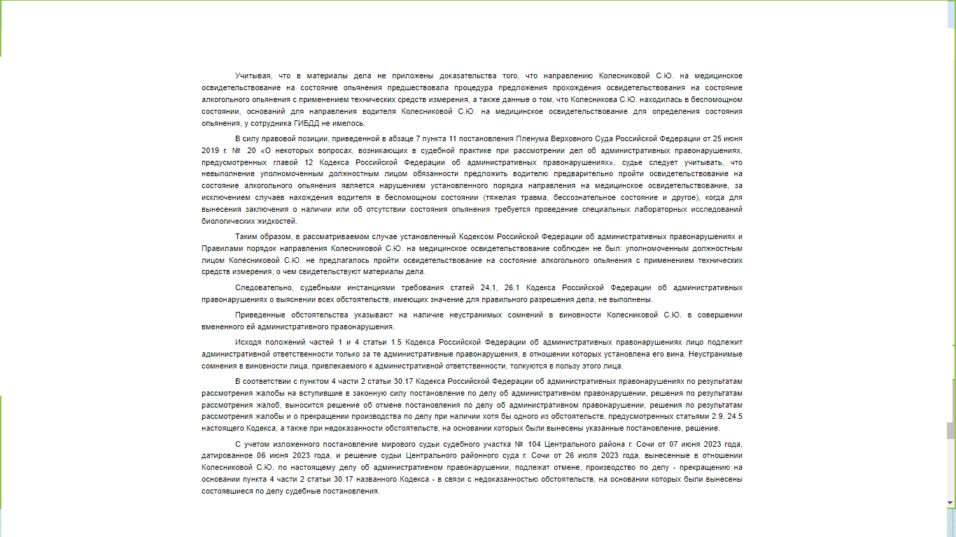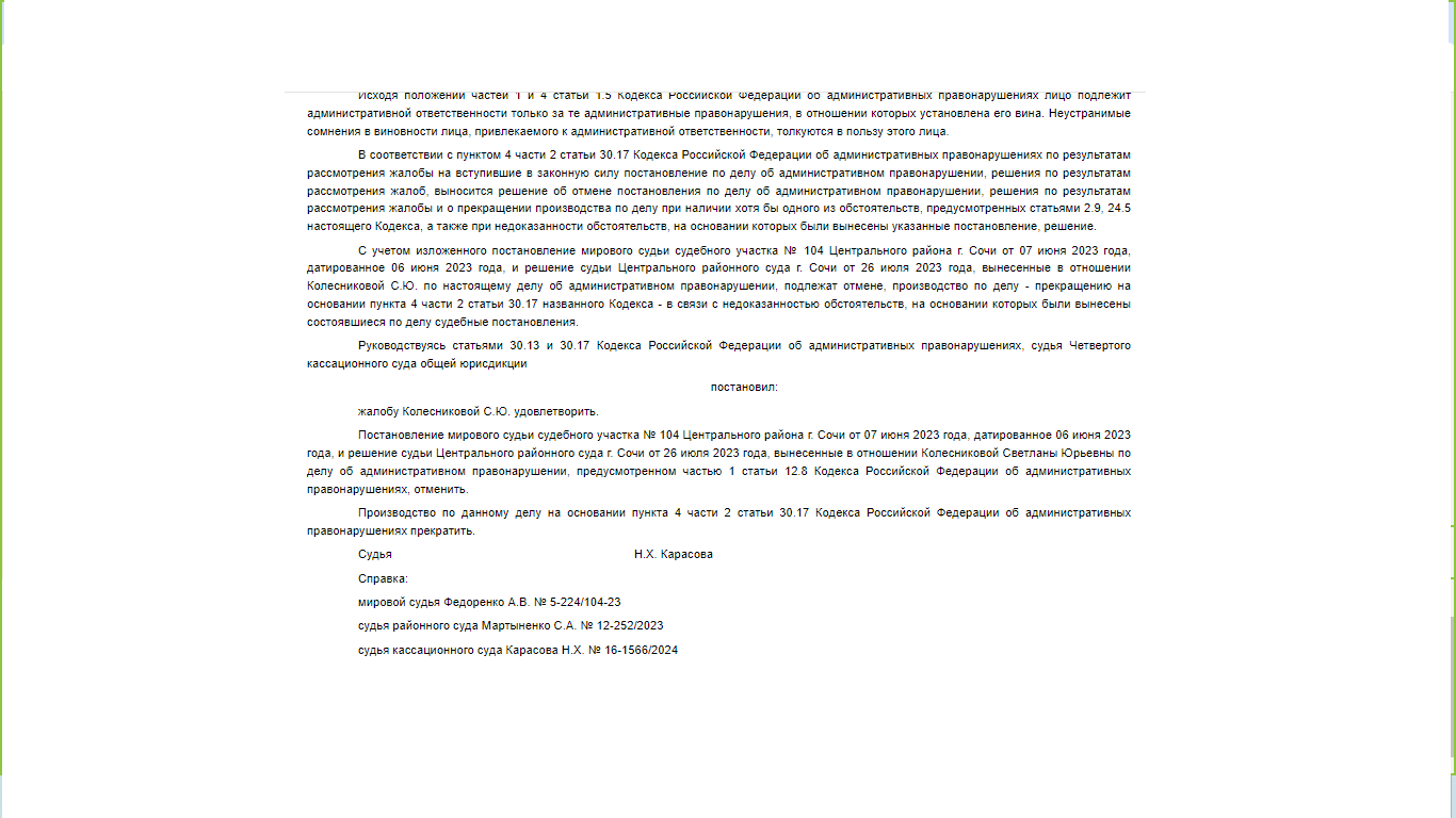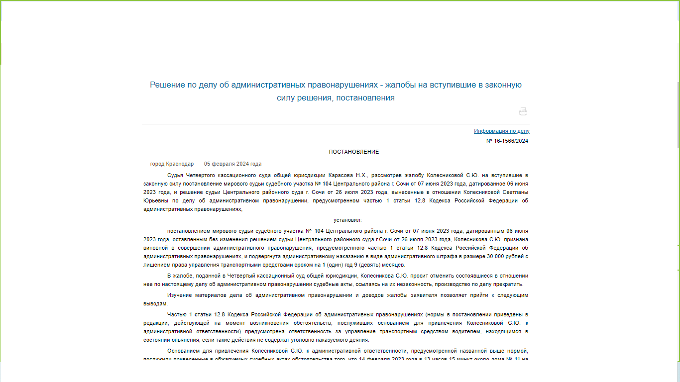 Существует судебная практика и ВС РФ по отмене таких постановлений. Но я приведу один пример судебной практики этого 2024 года. Наш 4-й кассационный суд отменил постановление о лишении прав по ст. 12.8 ч.1 КоАП РФ именно за данное нарушение со стороны сотрудника ГИБДД.