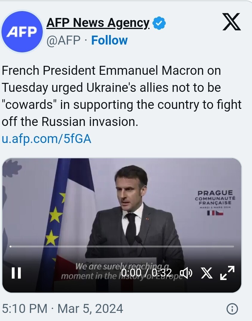 Во вторник президент Франции Эммануэль Макрон заявил экспатам в Праге, что союзникам Украины пора активизироваться, добавив, что "в нашей Европе приближается момент, когда будет уместно не быть трусом".