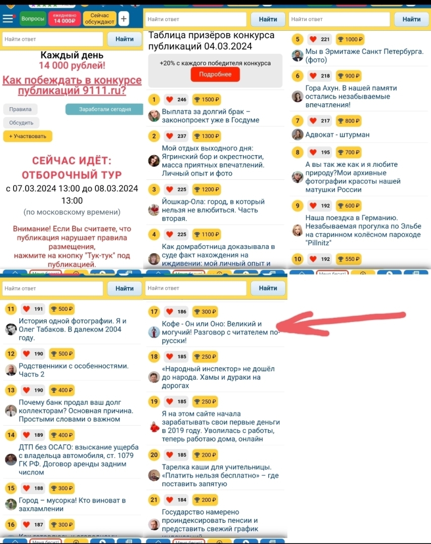 На сайте 9111. ru ежедневно проходит конкурс публикаций! (Статьи и видео) и Вы можете выкладывая свои статьи и видео ежедневно выигрывать от 50 до 1500 рублей!