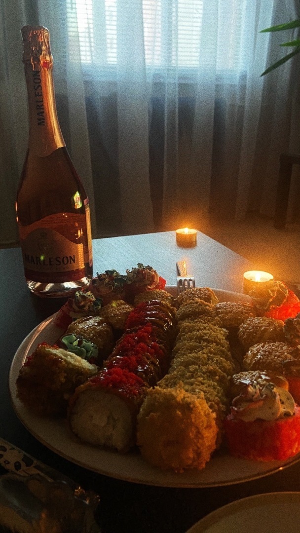 Вечером любимый сделал романтический ужин.Он ставит свечи, заказал мои любимые суши и открыл для нас бутылку хорошего шампанского.Мы с удовольствием ужинаем,беседуем и смотрим наши любимые передачи.