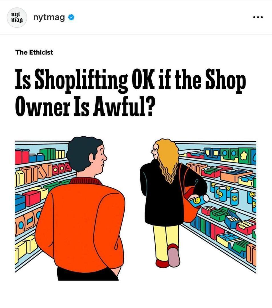 Статья The New York Times Magazine внимания заслуживает необычным вопросом, который заставляет читателей задуматься: «Можно ли воровать в магазине, если у него ужасный владелец?»