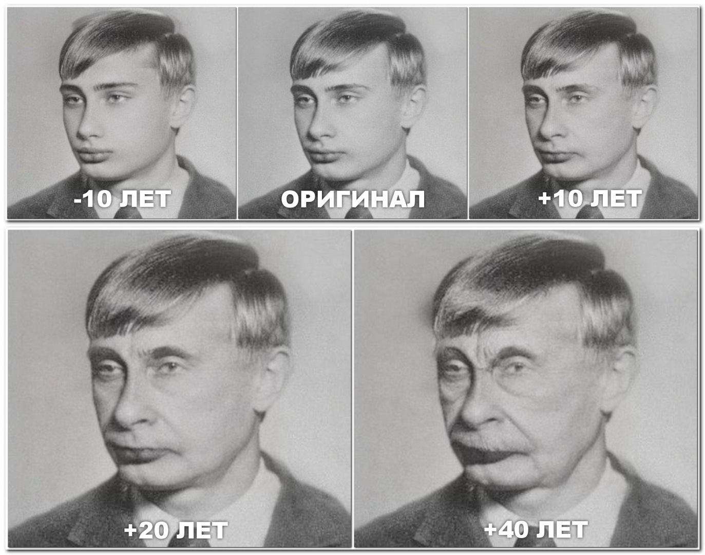 программы которые состаривают лица (применяются полицией для поиска пропавших без вести) и их результат. Типаж Путина--худощавый, сейчас показывают по ТВ типаж который тяготеет явно к полноте.