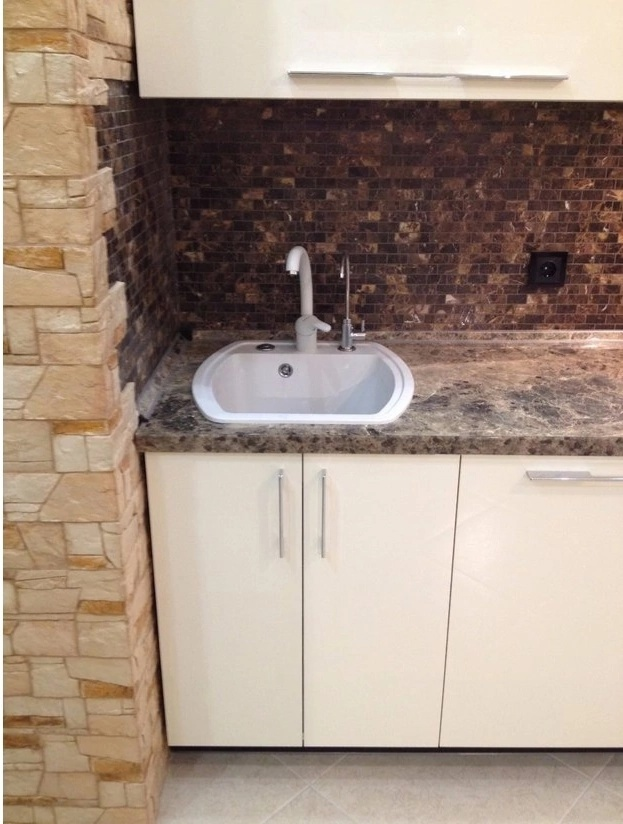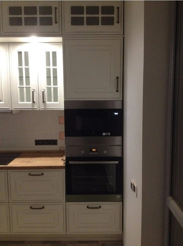 И что бы вы думали? Вместо того чтобы снять шкаф, просверлить две дырки повыше, забить дюбеля и навесить шкаф снова, отец начинает резать плитку! На одной плитке пришлось еще и угловой вырез делать, что удалось раза с третьего. И так бывает. До сих пор этот фартук стоит на кухне у родителей.