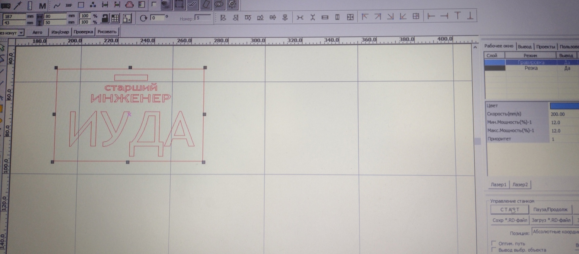 Выставил все необходимые параметры для гравировки и резки и запустил лазер.