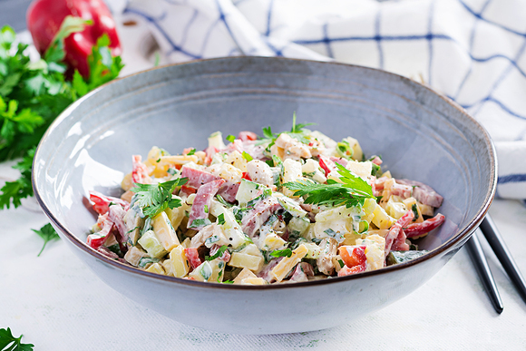 Вкусный салат с ветчиной, сыром и болгарским перцем. Приготовь за 15 минут.
