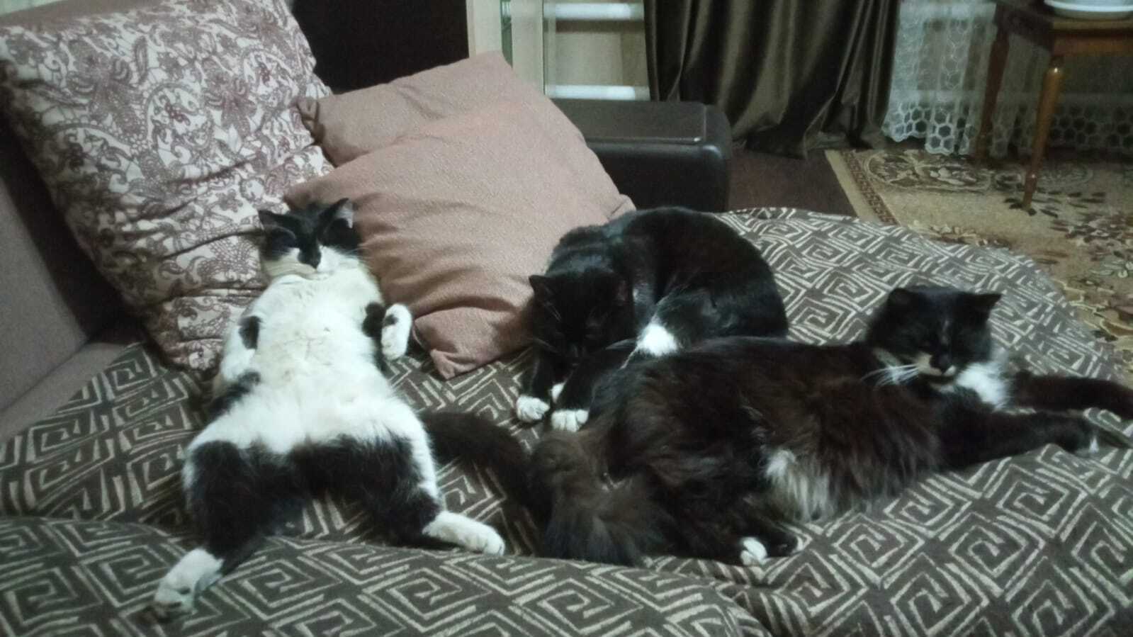 Милые котейки) У нас дома кошка и два ее уже взрослых котика-сына. Когда встал вопрос ,кого из котиков отдать, взрослые дочери возмутились. Оставили себе обоих