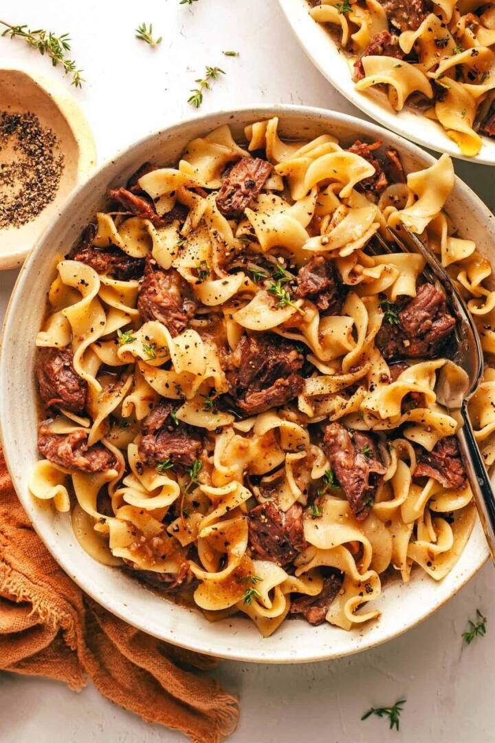2. Добавьте в кастрюлю оставшееся масло и лук. Обжаривайте 4-5 минут, периодически помешивая, до размягчения. Добавьте чеснок и готовьте 1 минуту, периодически помешивая. Добавьте 6 чашек говяжьего бульона, готовую говядину, тимьян, лавровый лист и перемешайте. Бульон должен покрыть говядину полностью.