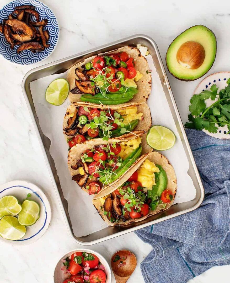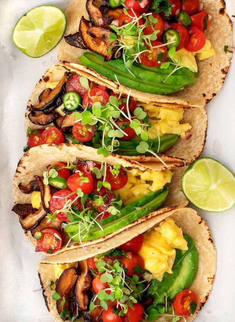 4. Соберите тако на тортилье/лепешке, добавив получившийся омлет, ломтики авокадо, запеченные шампиньоны и пико из помидоров черри. Сверху, по желанию посыпьте микрозеленью и можно подавать!