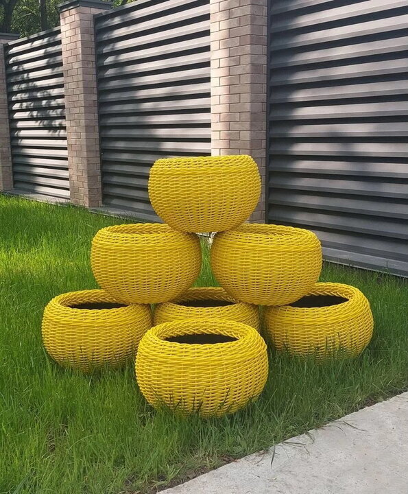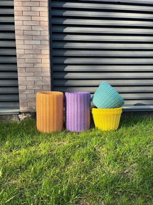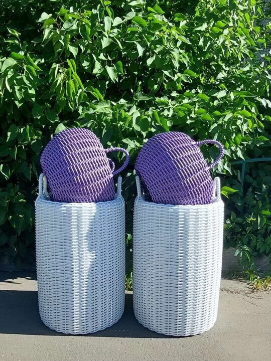 Всё вокруг засадила цветами, которые пышно расцвели в сплетённых ею же самой кашпо из полимерной нити. Однажды к ней в гости приехали "девочки" с бывшей работы и поразились, какая красота у Ольги на участке. Им так понравились разноцветные плетёные кашпо, вазоны и тумбы под цветы, что они попросили Ольгу сплести и им такую красоту.